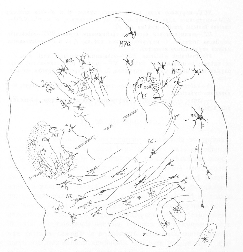 Большинство клѣтокъ внутренняго ядра клиновиднаго нучка отличается своей малой величиной и вѣтвистостью своего осевоцилиндрическаго отростка. Многіе изъ отростковъ вѣтвятся при этомъ такимъ образомъ, что среди множества получающихся вѣтвей нельзя бываетъ опредѣлить главную; эти отростки „теряютъ свою индивидуальность“ и, слѣдовательно, принадлежатъ къ элементамъ второго типа, по Golgi. Нѣкоторыя изъ ихъ вѣтвей оканчиваются свободною кисточкой, но всегда есть одна или нѣсколько вѣтокъ, идущихъ дальше въ томъ или другомъ направленіи. Ни одной несомнѣнной „клѣтки съ короткимъ отросткомъ“, въ смыслѣ Ramon у Cajal`я. я не видѣлъ въ продолговатомъ мозгу, какъ и въ спинномъ [4]).