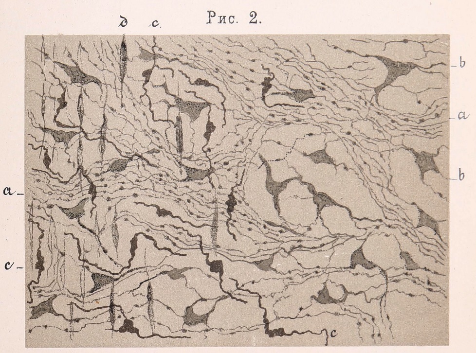 При этомъ клѣтки въ участкахъ ткани, ближайшихъ къ газу, принимали густой синій цвѣтъ и прекрасно вырисовывались со всѣми своими отростками и вѣточками и съ многочисленными переходами въ нервные пучки (см. рис. 1 и 2).