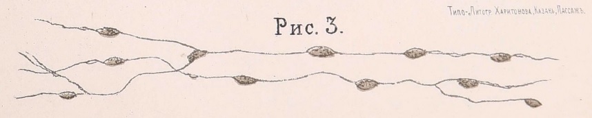 Такая окраска нервныхъ нитей наблюдается включительно до ихъ концовъ, какой бы видъ послѣдніе ни имѣли: видъ ли кустовъ, или кистей, древовидныя формы, либо формы нервныхъ клубковъ, завитковъ простыхъ и сложныхъ и т. п. На пути тонкихъ и тончайшихъ нитей осевыхъ цилиндровъ и частей ихъ перлы бываютъ нерѣдко очень крупны, величиной съ обыкновенныя ядра, и съ таковыми могутъ быть смѣшиваемы тѣмъ болѣе, что въ нихъ по краямъ и въ срединѣ нерѣдко открывается зернистость вродѣ ядрышекъ. Что же такое эти „перлы“, эта „точечность“, эта „варикозность“ авторовъ, эти очень красивыя жемчужинки въ веществѣ тонкихъ нервовъ? Вѣдь они видны не только съ метиленовой синькой, но въ мѣстахъ болѣе свободнаго положенія нервовъ (обонятельные, вкусовые, зрительные и слуховые концы) эти жемчужинки открываются и съ двухромокислымъ серебромъ (Golgi, Ramon у Kajal, Retzius и мн. другіе ученые) и даже съ одной осміевой кислотой, какъ несомнѣнно было показано Max’омъ Schultze, Лавдовскимъ и другими изслѣдователями нервовъ. Итакъ, что же это за структурныя принадлежности нервовъ, —эти перлы, эти жемчужинки ихъ?