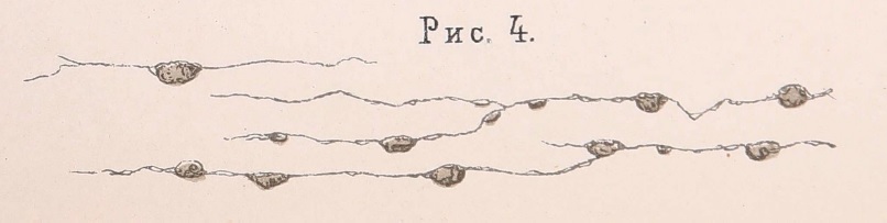 Утолщенія эти (см. рис. 1, 2, 3, 4) имѣютъ большею частью овальную или веретенообразную форму, словно нервныя нити состоятъ изъ маленькихъ веретенообразныхъ клѣточекъ. Эти то утолщенія, кажущіяся блестящими капельками, точечками, жемчужинками, похожими на чрезвычайно малыя клѣточки веретенообразной формы, и есть „нервная варикозность“ авторовъ. Отъ нея истинное нервное волокно имѣетъ видъ четокъ, отъ нея— столь своеобразна картина конечныхъ осевыхъ цилиндровъ, по ней, этой варикозности, легков ездѣ узнать тонкое нервное волокно. Вотъ признакъ, на который въ свое время обращалъ вниманіе ученыхъ проф. Лавдовскій въ своей вышецитированной диссертаціи, признакъ, какъ мы видимъ, дѣйствительно діагностическій, безъ котораго почти никогда не бываетъ нервнаго волокна. Если даже нервное волокно при жизни всасываетъ не только болѣе или менѣе индифферентный для нея растворъ метиленовой синьки, но гораздо сильнѣе дѣйствующія: Мюллеровскую жидкость, осміеву или хромовую кислоты (слабые растворы) и т. п., то, по импрегнаціи серебромъ, и тутъ нервы удерживаютъ данный имъ отъ природы признакъ, т. е. эти жемчужинки, перлы: нервное волокно является коричневой или черной нитью, которая на пути то утолщается въ жемчужинки, то утончается до своего обычнаго или еще меньшаго діаметра, являясь тонкимъ „осевымъ цилиндромъ. Въ старинныхъ гистологіяхъ, напр. Frey'a, и Kölliker'a, эти авторитеты нашей науки часто рисовали нервы съ точечностью или съ „припухлостями и утолщеніями“, приписывая ихъ дѣйствію хромовой кислоты и т. п. И послѣдующіе ученые думали, что такія волоконца искусственно измѣнены. Оказывается однако, что измѣненій тутъ немного, чтобы не сказать—вовсе нѣтъ, потому что такія волоконца сплошь и рядомъ наблюдаются при жизни. Метиленовая синька доказываетъ только-что сказанное наглядно, такъ что возраженія противъ перловидной варикозности, какъ основного признака структуры тонкихъ нервовъ, слѣдуетъ признать неосновательными. Допуская даже, что подобная варикозность встрѣчается мѣстами на волокнахъ соединительной ткани (напр. на барабанной сторонѣ спиральнаго листка слуховой улитки, гдѣ органъ Corti)—все-таки не забудемъ, что это бываетъ только на молодыхъ волокнахъ. Да и волокна ли это соединительной ткани: можетъ быть, и они нервныя?