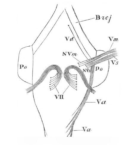 Схема, показывающая взаимное отношеніе корешковъ и ядеръ Ѵ-й и ѴІІ-й паръ.