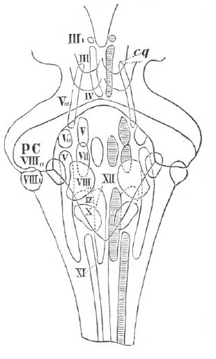 Bq—четверохолміе, PC—средняя мозжечковая ножка, Ш—ядро n. oculomo- torii, III'—переднее ядро того же нерва, IV—ядро n. trochlearis, V—двигательное ядро n. trigemini, Ѵ'''—сомнительное переднее ядро того же нерва (сопровождающее его нисходящій корешокъ) V—среднее чувствительное ядро, V—длинное заднее чувствительное ядро, отъ котораго начинается его восходящій корешокъ), VI—ядро n. abducentis, VII—ядро n. facialis, VIII' VIII' и ѴІІІ"—ядра n. acustici, IX—ядро n. glossopharingei, X—ядро n. vagi, XI—ядро n. accessorii, XII—ядро n. hypoglossi.