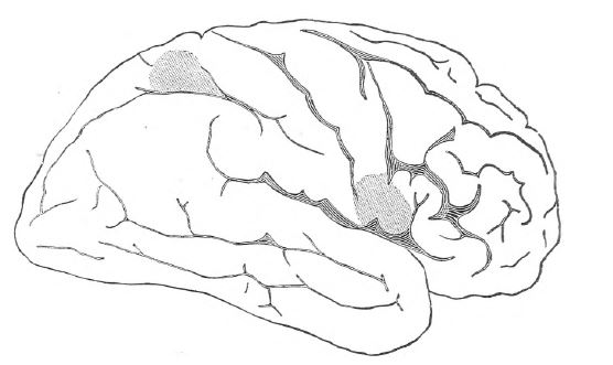 Выше мы привели наблюденіе Lepine’a, гдѣ тризмъ развился, осложняя собою картину лѣвосторонней гемиплегіи.При вскрытіи были найдены два фокуса въ правомъ полушаріи (см. фиг. III): одинъ въ области верхней темянной извилины, непосредственно за задней центральной, другой— около основанія передней центральной. (О фокусѣ въ лѣвомъ полушаріи я не упоминаю, такъ какъ онъ оказался уже стараго происхожденія и до второго инсульта не обнаруживался явленіями тризма).