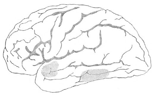 Въ случаѣ Samt’a 10) у больной черезъ восемь дней послѣ травмы черепа развился тризмъ, существовавшій въ теченіе двухъ дней до самой смерти. Вскрытіе констатировало ограниченное гнѣздо размягченія въ корѣ третьей лѣвой височной извилины, переходившее частью на вторую; рядомъ съ нимъ кпереди и внутрь замѣчался еще довольно значительный, но болѣе поверхностный, фокусъ въ корѣ передняго отдѣла первой и второй височныхъ извилинъ.