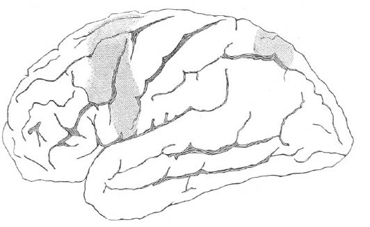 Несравненно менѣе понятнымъ является отсутствіе симптомовъ паралича па ряду съ симптомами раздраженія. Вся психомоторная область занята двигательными центрами, которые, какъ Вы знаете, въ значительной степени обособлены другъ отъ друга, по крайней мѣрѣ у человѣка.