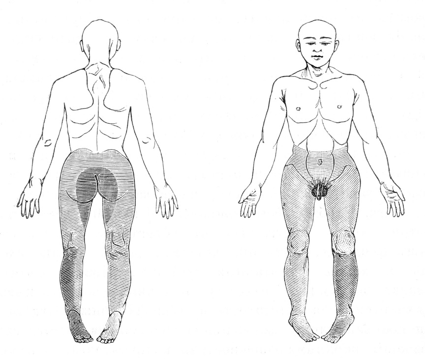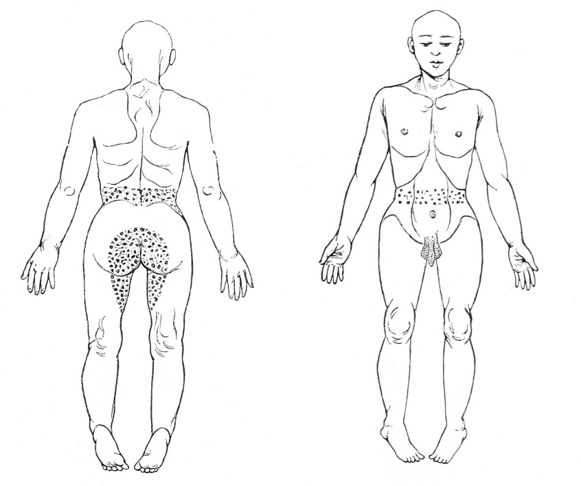 Абсолютную утрату чувствительности мы открываемъ также на половомъ членѣ, мошонкѣ и промежности. На туловищѣ нѣкоторое ослабленіе чувствительности иногда удается показать на животѣ ниже пупка; но тутъ отвѣты больного столь разнорѣчивы, что о нихъ нужно говорить съ большой осторожностью.