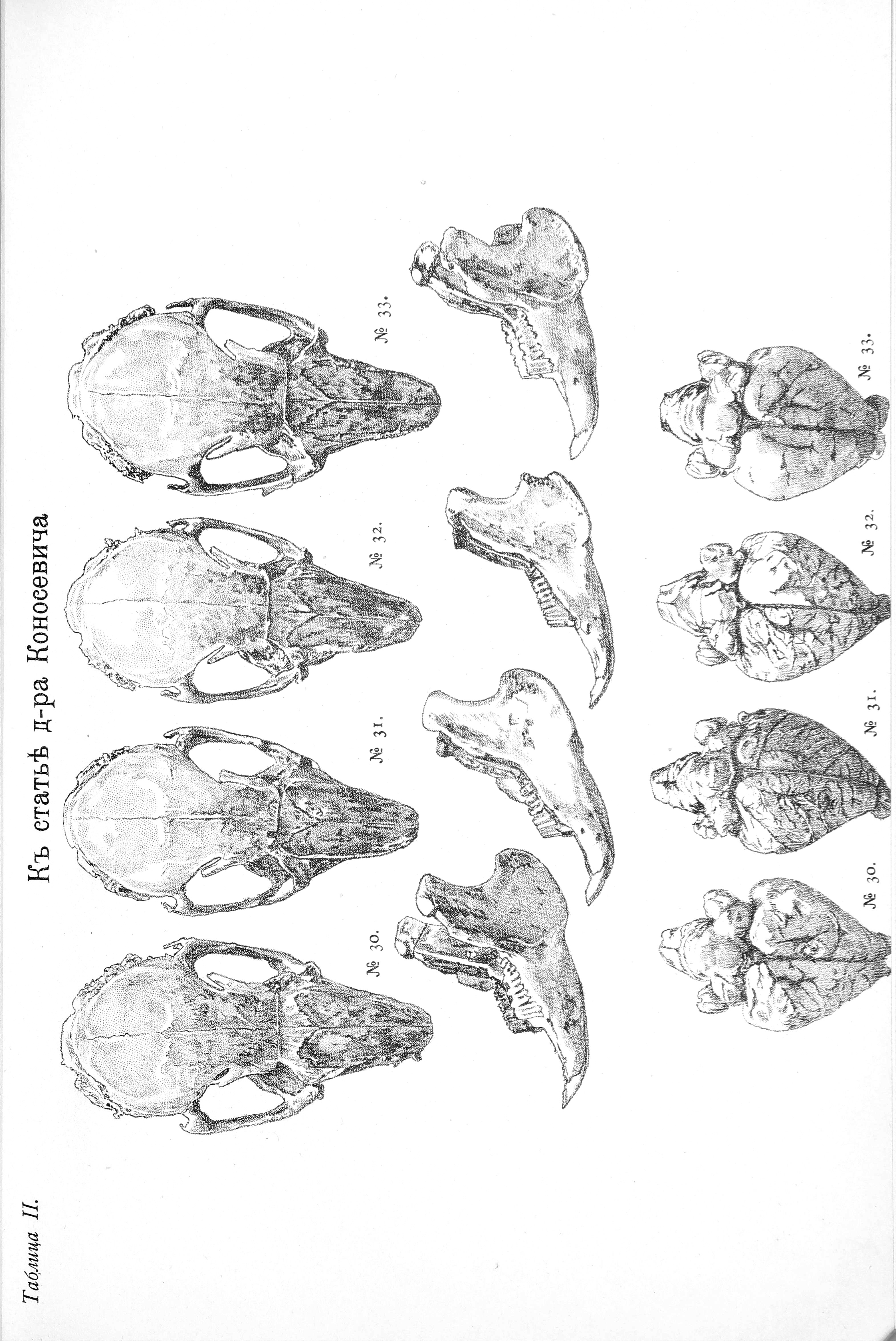 № 17. Кроликъ бѣлый. Вѣсъ 303 грм. Размѣры головы: длина 59,5 mm, ширина 32,5 mm. 5 февр. 1897 г. перерѣзаны а. vertebralis dextra и а. carot. com. dextra. 8 февр. перерѣзана а. carot. com. sinistra. Вѣсъ 20 февр. 460 грм. (на 10 грм. выше контрольнаго; въ день первой операціи онъ былъ выше на 8 грм.). Вѣсъ 5 марта 557 (на 25 грм. ниже контрольнаго). 14 марта вознамѣрился исключить послѣдній сосудъ—а. vertebsalis sinistra. Перерѣзавъ pars sterno-mastoidea (m. sterno-cleido-mastoidei) и открывъ артерію, я былъ удивленъ при видѣ крупныхъ ея размѣровъ и рѣзать не рѣшился, а отложилъ эту операцію до того дня, когда мнѣ все-равно придется убивать кролика: такъ мало я надѣялся на то. чтобы животное вынесло перерѣзку послѣдняго шейнаго сосуда (вліяніе Пекёра и другихъ). Вѣсъ 27 марта 668 грм. (на 28 грам. меньше контрольнаго). 20 апрѣля (вмѣстѣ съ крол. № 16, см. выше) сданъ въ отдѣленіе для животныхъ при лабораторіи. 7 мая получилъ увѣдомленіе о гибели кролика; вѣсъ 790 грм. (т. е. на 195 грм. меньше контрольнаго!). (Столь быструю кончину животнаго, послѣ ухода отъ меня, и такое сильное паденіе его въ вѣсѣ, противъ контральнаго, ничѣмъ инымъ не могу объяснить, какъ нерадѣніемъ къ своему дѣлу служителей лабораторіи, па попеченіи которыхъ находится упомянутый питомникъ , въ чемъ впослѣдствіи я еще разъ убѣдился горькимъ опытомъ. Очищая потомъ черепъ отъ мягкихъ частей, я извлекалъ изо рта и изъ глазницъ червей какъ у кролика № 16, такъ и у № 17!). Вскрытіе: прав. и лѣв. общая сонная (выше и ниже перерѣзки) 1 mm; прав. позвоночная (ниже перерѣзки) 0,9 mm; лѣв. позвоночная 21/4 mm.