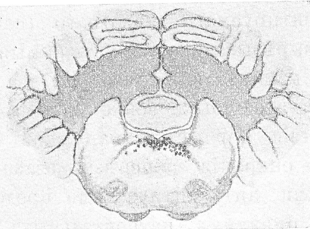 На срѣзахъ, проведенныхъ соотвѣтственно уровню передняго двухолмія , перерожденіе наблюдалось въ ядрахъ обоихъ глазодвигательныхъ нервовъ, при чемъ ядро, соотвѣтствующее сторонѣ разрушенія, перерождалось болѣе, чѣмъ противоположное ядро. Далѣе на срѣзахъ , проведенныхъ черезъ Вароліевъ мостъ, наблюдалось перерожденіе въ ядрахъ отводящихъ нервовъ, при чемъ здѣсь ядро, противоположное сторонѣ разрушенія, перерождалось болѣе, чѣмъ ядро стороны разрушенія. Задніе продольные пучки перерождались на обѣихъ сторонахъ; слѣдуетъ здѣсь замѣтить, что на срѣзахъ, проведенныхъ черезъ переднее двухолміе, изъ заднихъ продольныхъ пучковъ былъ болѣе перерожденъ пучекъ, соотвѣтствующій сторонѣ разрушенія. Затѣмъ на срѣзахъ, проведенныхъ болѣе кзади, соотвѣтственно Вароліеву мосту, задній продольный пучекъ, противоположный сторонѣ разрушенія, представлялъ болѣе сильное перерожденіе, чѣмъ пучекъ стороны разрушенія.