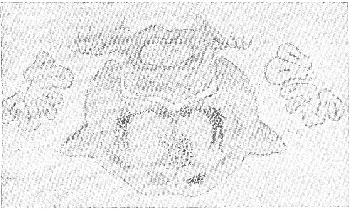 На срѣзахъ, соотвѣтствующихъ уровню ядеръ отводящихъ нервовъ, перерожденіе наблюдалось въ корешкахъ отводящаго нерва, соотвѣтствующаго сторонѣ перерѣзки; по этимъ корешкамъ перерожденіе достигало ядра отводящаго нерва, затѣмъ изъ ядра перерожденныя волокна шли къ заднему продольному пучку этой-же стороны, переходили черезъ срединную линію препарата въ задній продольный пучекъ противоположной стороны, и наконецъ изъ него часть перерожденныхъ волоконъ подходила къ ядру противоположнаго отводящаго нерва, при чемъ въ самомъ ядрѣ также было замѣтно незначительное перерожденіе, которое было гораздо меньше, чѣмъ перерожденіе въ ядрѣ отводящаго нерва, соотвѣтствующаго сторонѣ раздраженія (см. рис. 1).