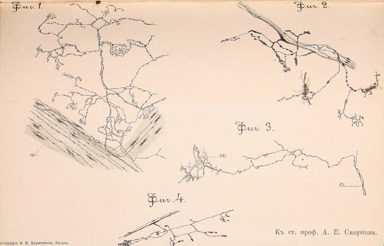 Фигура 1-я взята съ препарата бѣлковицы взрослой собаки изъ области задняго полюса глазного яблока послѣ окраски нервовъ по способу Р. Ehrlich’а. Рисованіе производилось при помощи camera lucida Аbbé-Reichert'а подъ микроскопомъ С. Reichert'а, при окул. 3. объкт. 8 а. На данномъ рисункѣ изъ толстаго нервнаго стволика а, состоящаго изъ мякотныхъ и безмякотныхъ (узловатыхъ) волоконъ, выходятъ отдѣльныя нервныя волокна, которыя на своемъ пути многократно вѣтвятся, вѣтви идутъ въ различныхъ направленіяхъ и значительная часть ихъ переходитъ въ нервныя свободныя окончанія кустовидной формы. Я не вхожу въ детальное описаніе развѣтвленій, хода варикозныхъ нервныхъ вѣтвей и разнообразія формы и величины нервныхъ окончаній, ибо это достаточно ясно изъ разсмотрѣнія самого рисунка; скажу лишь, что всѣ эти окончанія залегаютъ во внутренней трети толщи бѣлковицы свободно между пучками и пучечками соединительнотканныхъ волоконъ склеры.