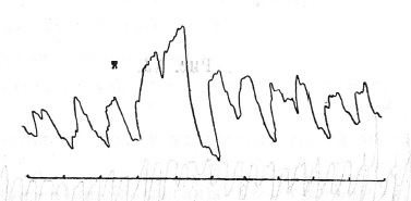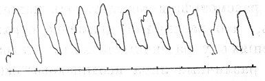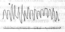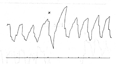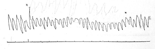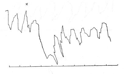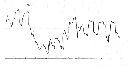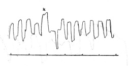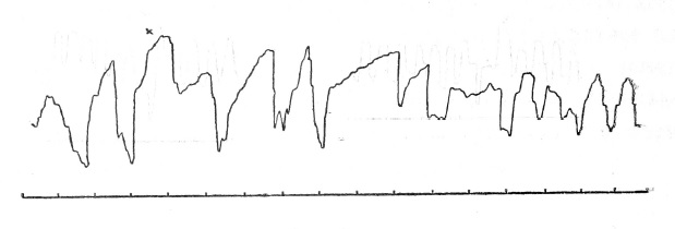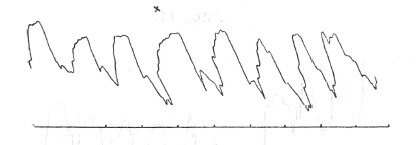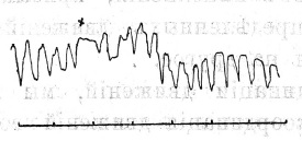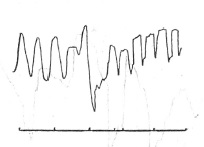 Наконецъ, весьма рѣзко отражается на кривой мышечное напряженіе, обусловливаемое сильнымъ противодѣйствіемъ извѣстному движенію, въ формѣ противодвиженія, со стороны изслѣдующаго лица: при этомъ измѣняется, какъ величина, такъ и ритмъ размаха кривой въ теченіе времени напряженія мышцъ.