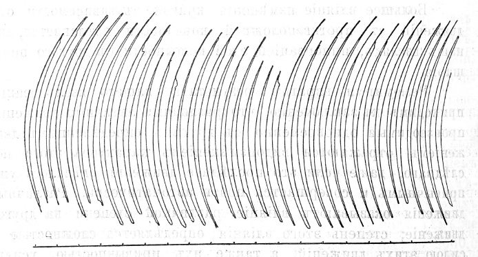 Пользуясь кривыми своихъ опытовъ вообще и отчасти основываясь на приведенныхъ рисункахъ, попробую установить главныя общія свойства нормальной кривой движенія средняго пальца; сдѣлать это необходимо, чтобы имѣть основанія судить объ уклоненіи кривой отъ нормы, а, слѣдовательно, и объ измѣненіи характера самаго движенія подъ вліяніемъ какого-либо агента. Первое свойство нормальной кривой, зависящее отъ большаго или меньшаго постоянства скорости движенія—это ея ритмичность, выражающаяся приблизительно одинаковымъ числомъ волнообразныхъ колебаній ея въ секунду. Нормальная кривая ритмична.