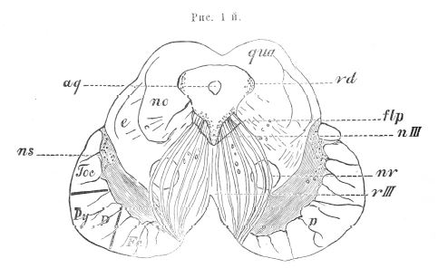 Чтобы мои слова были болѣе понятны, я попрошу Васъ взглянуть на эту схему, изображающую поперечный разрѣзъ передняго четверохолмія и ножки мозга.