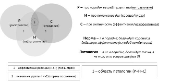 Модель. Гипотеза №1: патология возникает при выполнении трёх и только трёх условий — нарушение порядка (disorder/расстройство), неблагополучие, страдание. Поскольку каждое из трёх условий необходимо для развития патологии, то никакие комбинации двух условий не порождают патологию (зоны 1, 2 на рис. 1). Даже выполнение трёх условий не свидетельствует о патологии, но наличие патологии требует, чтобы все три условия выполнялись.