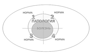 Следует различать патологические реакции, патологические состояния, патологический процесс и патологическое развитие. Последнее бывает неблагоприятным вариантом аномального развития (например, умственная отсталость) либо нейтральной аномалии (например, гомосексуальность), либо благоприятной (например, одарённость) аномалии. Болезнь, как частный случай патологии (ограниченная область внутри зоны 3), включает состояния, требующие лечения — сюда можно отнести все варианты патологических процессов и тяжёлые формы патологического развития. На границе этой области расположены затяжные патологические реакции и тяжёлые стационарные патологические состояния.