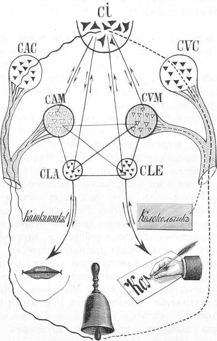 Что касается формы, въ которой проявляется мозговая дѣятельность, то это стоитъ въ зависимости отъ мѣста, гдѣ одинъ видъ энергіи—мысль переходитъ въ другой—въ движеніе, отъ объема, въ предѣлахъ котораго происходятъ мышечныя сокращенія, отъ сочетанія различныхъ мышечныхъ группъ и т. д.; вздохъ, стонъ, крикъ, мимика, рисованіе, письмо и сама рѣчь, все это проявленія центральной мозговой дѣятельности (С. Штейнбергъ5). Итакъ, говоритъ проф. Сѣченовъ 6), всѣ внѣшнія проявленія мозговой дѣятельности могутъ быть сведены на мышечныя движенія.