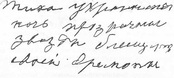 Рука при письмѣ должна имѣть точки опоры, изъ которыхъ однѣ, по Еrlеnmеуеr’у13), остаются стабильными, тогда какъ другія во время письма движутся—лабильныя точки. Для кисти неподвижной точкой опоры будетъ служить os pisiforme, какъ опорный пунктъ, около котораго совершаются движенія вправо и влѣво въ лучезапястномъ суставѣ. Для предплечія фиксаціоннымъ пунктомъ будетъ condylus internus. Въ виду существованія указанныхъ точекъ опоры, около которыхъ по дугѣ круга съ радіусомъ равнымъ разстоянію отъ конца пера до точки опоры, должно совершаться движеніе, Erlenmeyer считаетъ естественнымъ письмомъ, тогда какъ письмо по прямымъ линіямъ, по стокамъ, идущимъ горизонтально, является письмомъ заученнымъ, требующимъ глазомѣра. Какъ на историческій примѣръ дугообразнаго письма указываютъ на манускрипты Александра фонъ- Гумбольдта. Физіологически дугообразное письмо можно нерѣдко встрѣтить у дѣтей еще мало опытныхъ въ письмѣ, а какъ болѣзненное явленіе, замѣтимъ между прочимъ, намъ приходилось встрѣчать его у страдающихъ душевной болѣзнью, напр. при прогрессивномъ параличѣ помѣшанныхъ.