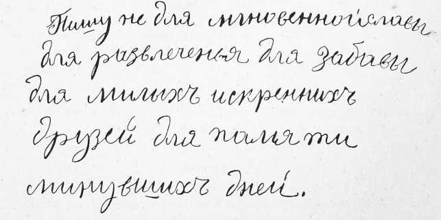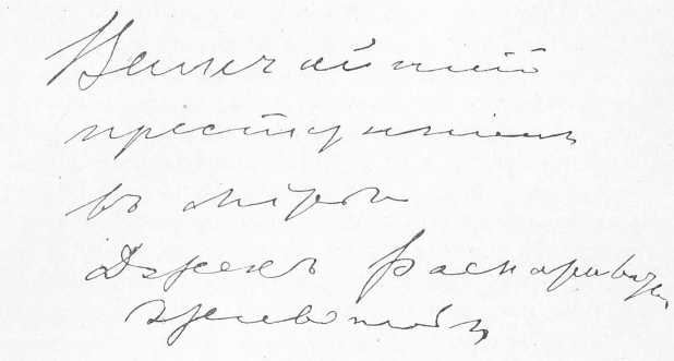 Приведенный образчикъ №1 принадлежитъ больному, наблюдаемому нами въ меланхолическомъ состояніи. Какъ особенность его состоянія можно отмѣтить то, что случай этотъ относится къ меланхолической формѣ паранойи, но носитъ на себѣ черты, отмѣчаемыя авторами при меланхоліи. Онъ можетъ служить образчикомъ легкаго, слабаго, женственнаго письма, но въ то же время рѣзкое утонченіе къ концу каждой строки говоритъ за быстроту написаннаго. Это не стоитъ въ противорѣчіи съ клиническими явленіями, такъ какъ меланхолія больного по своему виду должна быть отнесена къ mel. agitans въ средней степени, что видно изъ исторіи болѣзни.