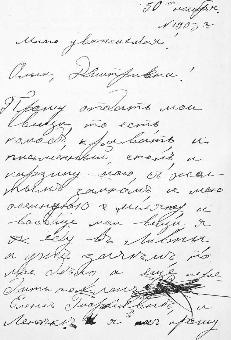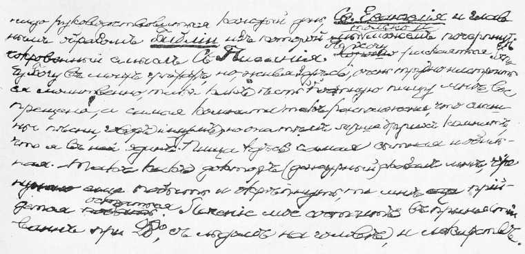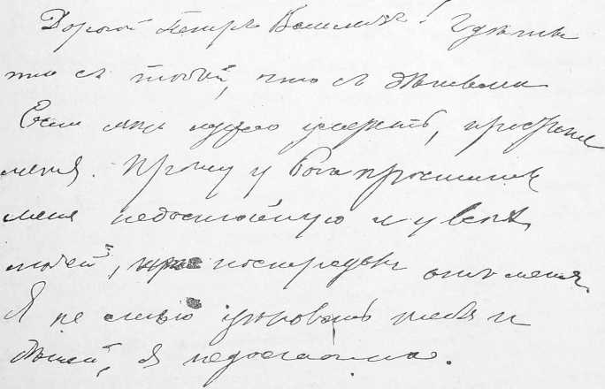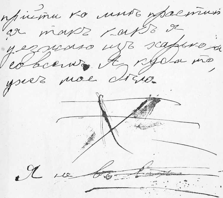 Небрежность, помарки и довольно легкій почеркъ можно, судя по этому образчику, отнести на счетъ болѣзненнаго состоянія. Здѣсь также выступаетъ короткая конструкція фразъ, какъ и въ письмѣ №3, приведенномъ нами выше.