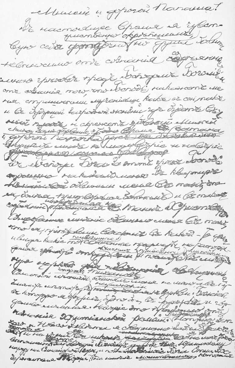 Я теперь совершенно не сплю. Я очень боленъ и отчаиваюсь въ спасеніи моей души. Хотѣлось бы мнѣ какъ нибудь покончить съ собою. Надѣюсь скоро увидѣть васъ. Меня сильно страшитъ адъ. Я чувствую, что мнѣ хуже, и теряю надежду поправиться. Я часто думаю о томъ, сколько денегъ я потерялъ. Боюсь, что эта потеря посылается мнѣ какъ наказаніе за мои богохульственныя рѣчи и сочиненія. Желалъ бы я умереть. Здѣшнее начальство очень внимательно ко мнѣ. Надѣюсь вскорѣ жить съ вами. Боюсь, что я умру скоропостижно. Съ вами я былъ бы счастливѣе. Пишите скорѣе. Я ужастно боюсь ада“ и т. д.4).