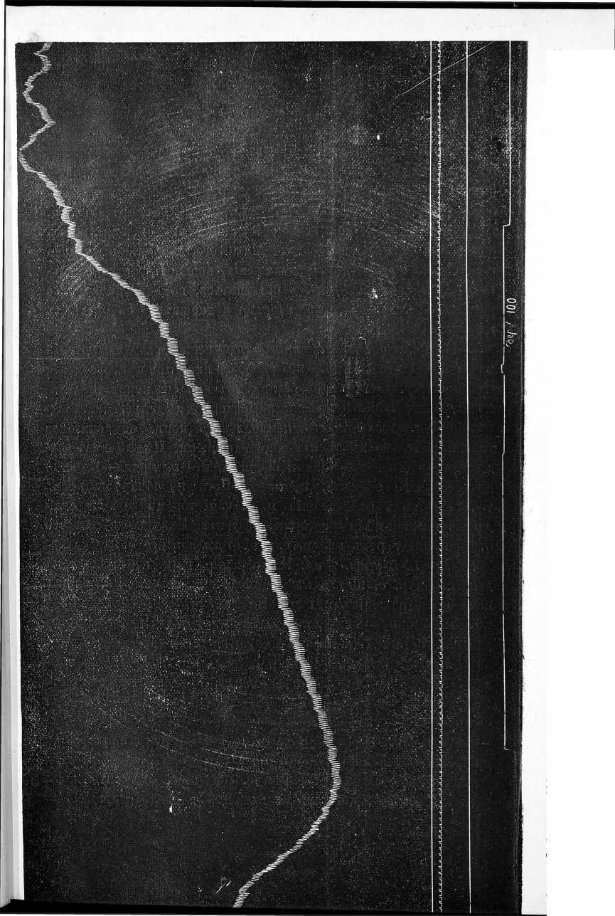 На этой кривой давленіе въ моментъ начала раздраженія ц.к. vagi было 174—176 мм. Hg. Въ концѣ раздраженія— 50 мм. Hg. Раздраженіе продолжалось 88—89 секундъ. Давленіе слѣдовательно пало болѣе чѣмъ на 2/3 первоначальнаго. Намека гдѣ либо на возвращеніе пониженнаго давленія къ первоначальному уровню нѣтъ. Мало того, давленіе нѣсколько секундъ, по прекращеніи раздраженія, еще понижается и только затѣмъ начинаетъ отлого повышаться, но первоначальнаго уровня еще долго не достигаетъ, а держится на среднихъ цифрахъ.