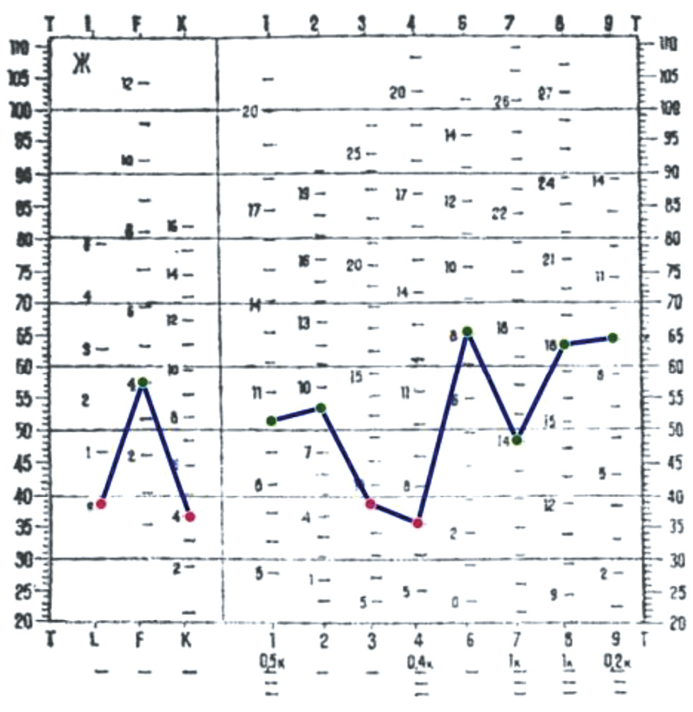 Experimental psychological examination (Dasha). The Leonhard–Shmishek questionnaire showed high values: 21 points on the dysthymia scale. The Beck Depression Inventory showed 22 points (cognitive–affective manifestations, 17 points; somatic, 5 points), indicating a moderate depressive episode. According to the brief multifactor personality questionnaire (Fig. 2), she had a tendency to resentment and distrust against moderately low mood.