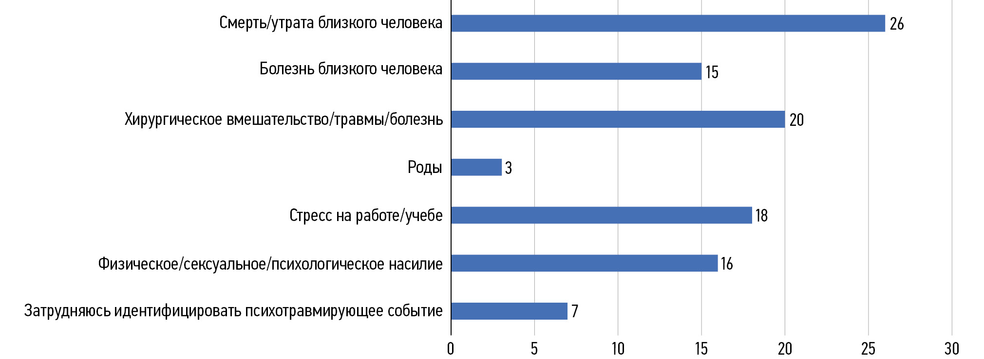 Рис. 1. Распределение характера психотравмирующих событий, предшествовавших формированию хронического болевого синдрома.