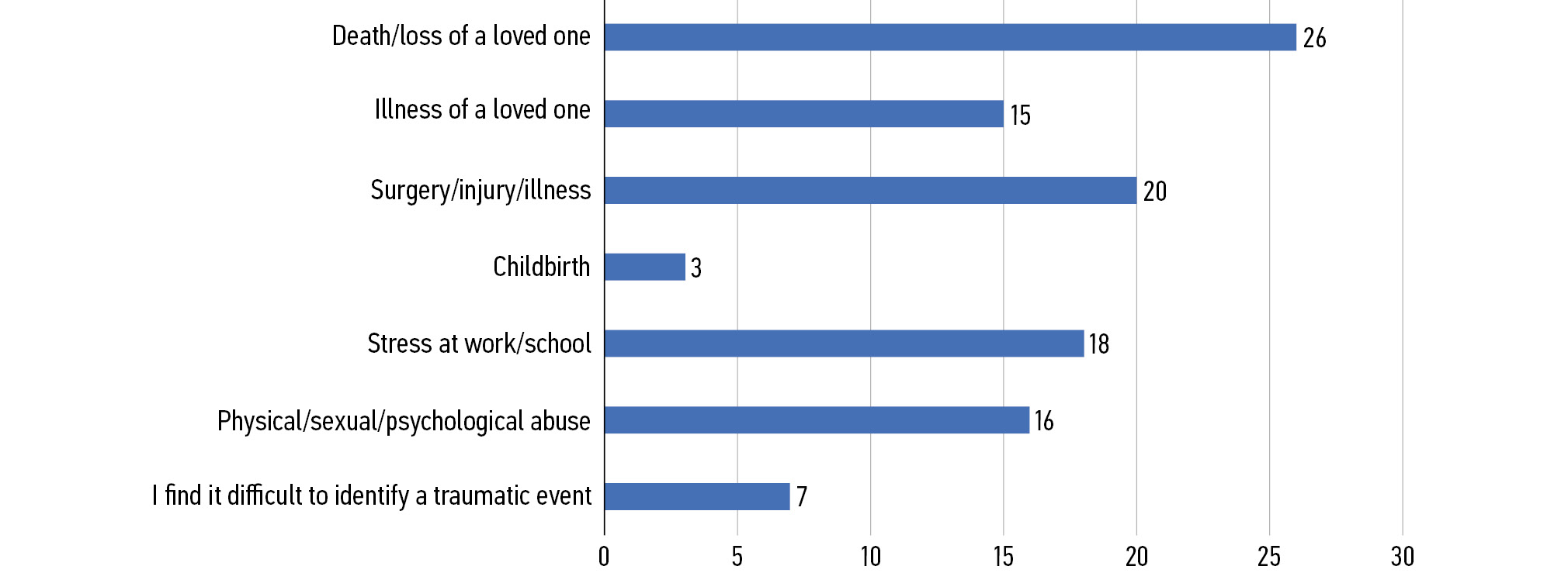 Как можно убедиться из рис. 1, наиболее частым типом психотравмирующих событий была утрата близкого человека (26 наблюдений, 24,7%), за которой с незначительным отрывом следовали болезнь, а также стресс на работе. Кроме того, заслуживает упоминания тот факт, что лишь малая часть пациентов совершенно не смогли идентифицировать психотравмирующее событие, которое, по их мнению, предшествовало развитию хронического болевого синдрома (7 наблюдений, 6,6%).