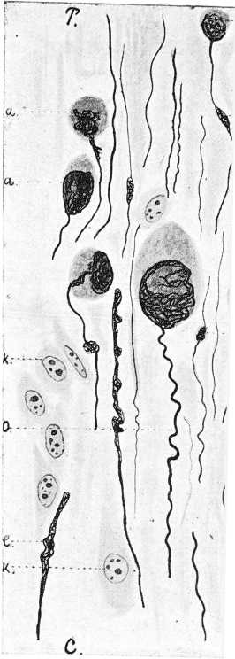Происхожденія большинства этихъ волоконецъ прослѣдить не удается, меньшая же часть ихъ представляетъ вѣтви осевыхъ цилиндровъ. Иногда видно, что вѣтви отдѣляются отъ цилиндровъ ниже концевыхъ утолщеній, въ болѣе же рѣдкихъ случаяхъ непосредственно отъ послѣднихъ. Нерѣдко осевые цилиндры раздѣляются дихотомически или вилообразно. Нѣкоторыя изъ вѣтвей оканчиваются также компактными равномѣрно импрегнированными утолщеніями, другія же теряются въ срѣзѣ. Какъ правило, онѣ направляются къ мѣсту разрѣза, имѣя иногда очень косой ходъ, болѣе же рѣдко онѣ заворачиваютъ въ сторону мозга. На тонкихъ волоконцахъ, проходящихъ между новообразованными клѣтками за краемъ нерва, видны утолщенія, а изрѣдка и дихотомическія дѣленія.