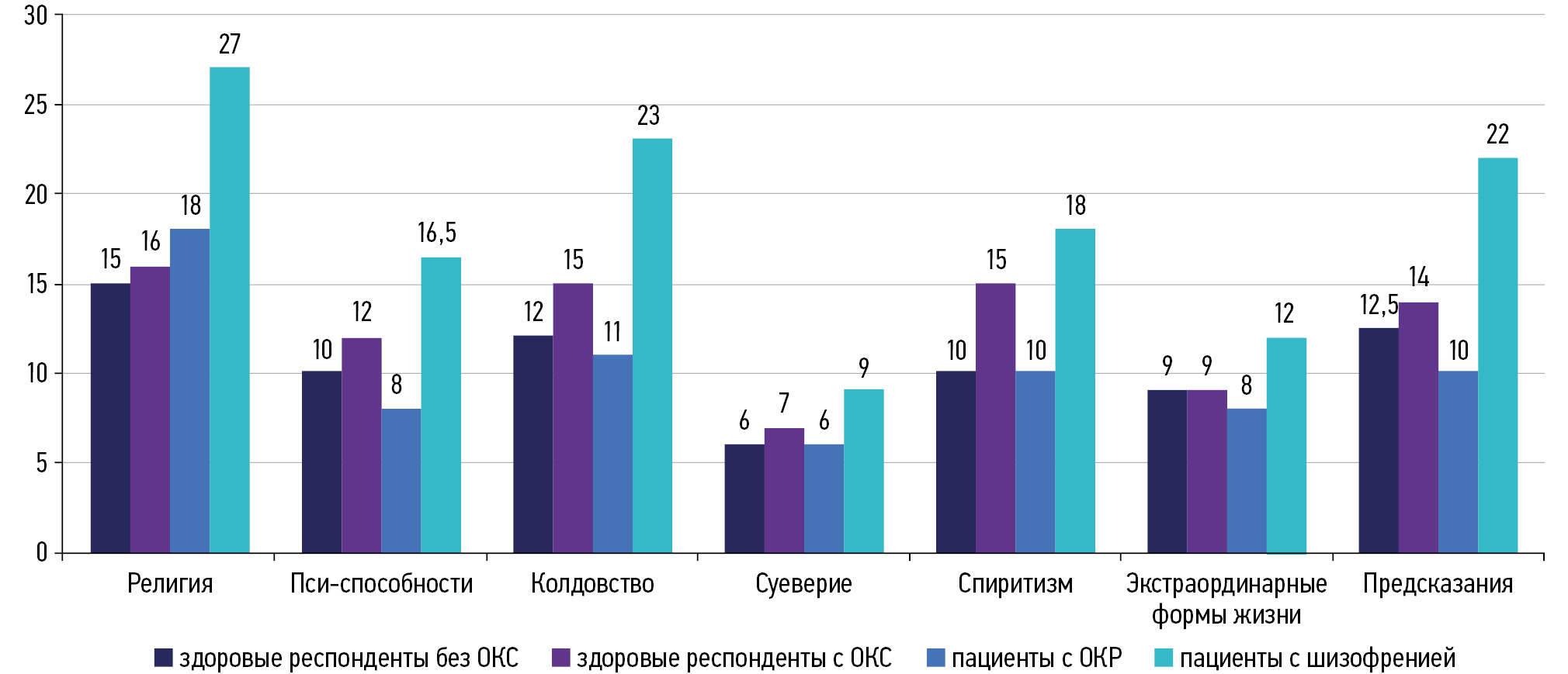Показана роль ММ и суеверности в симптомах ОКР [9, 10]: пациенты совершают компульсии, которые, по их мнению, помогают предотвращать наступление негативных событий [11], что способствует повышению чувства контроля [12]. D.A. Einstein и соавт. обнаружили, что чем выше уровень веры в паранормальное, тем более ярко выражены ОКС [10, 13].