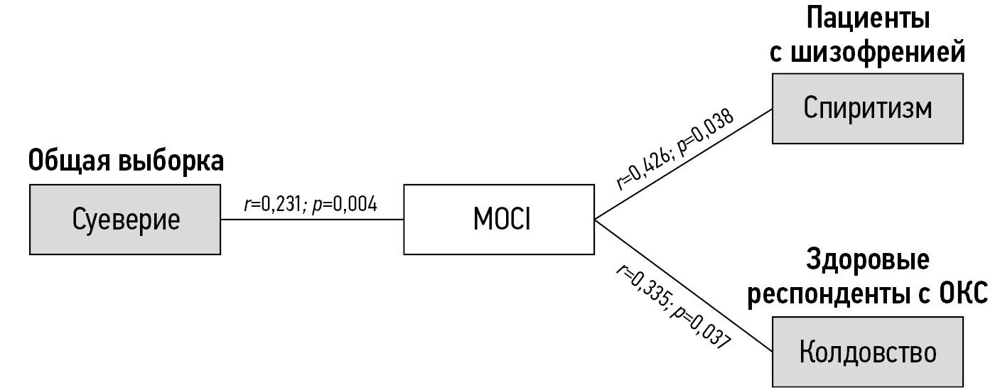 В общей выборке была положительная взаимосвязь между выраженностью ОКС по MOCI и субшкалой «Суеверие» (r=0,231; р=0,004). В группе здоровых респондентов с ОКС выявилась положительная корреляция с «Колдовством» (r=0,335; р=0,037), в группе пациентов с шизофренией — со «Спиритизмом» (r=0,426; р=0,038).
