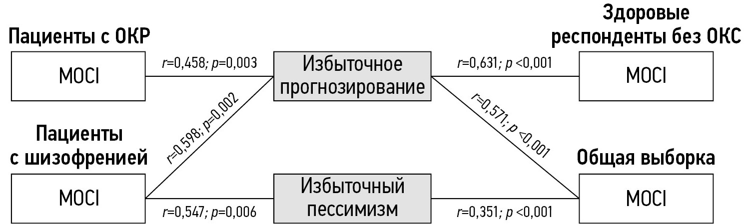 Выяснилось, что чем выше уровень прогнозирования, тем более выражены ОКС почти во всех группах. Также избыточный пессимизм имел положительную взаимосвязь с показателями MOCI у пациентов с шизофренией (r=0,547; р=0,006) и в общей выборке (r=0,351; р <0,001).