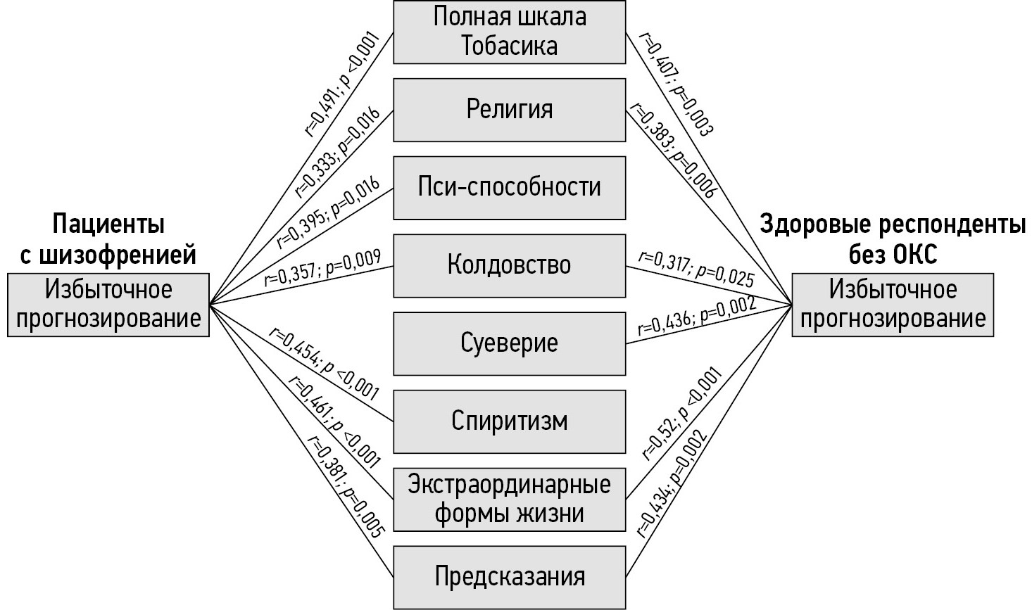 Избыточное прогнозирование имело положительную взаимосвязь с полной шкалой веры в паранормальное Тобасика в группе здоровых респондентов без ОКС (r=0,407; р=0,003) и в группе пациентов с шизофренией (r=0,491; р <0,001). Также положительные корреляции в этих группах были почти со всеми субшкалами.