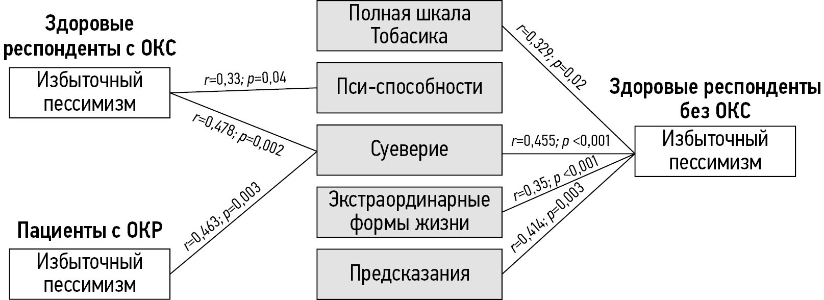 Избыточный пессимизм положительно коррелировал с субшкалой «Суеверие» среди здоровых респондентов без ОКС (r=0,455; р <0,001), здоровых респондентов с ОКС (r=0,478; р=0,002) и пациентов с ОКР (r=0,463; р=0,003). Также были положительные взаимосвязи с верой в «Пси-способности», «Экстраординарные формы жизни», «Предсказания» в зависимости от группы.