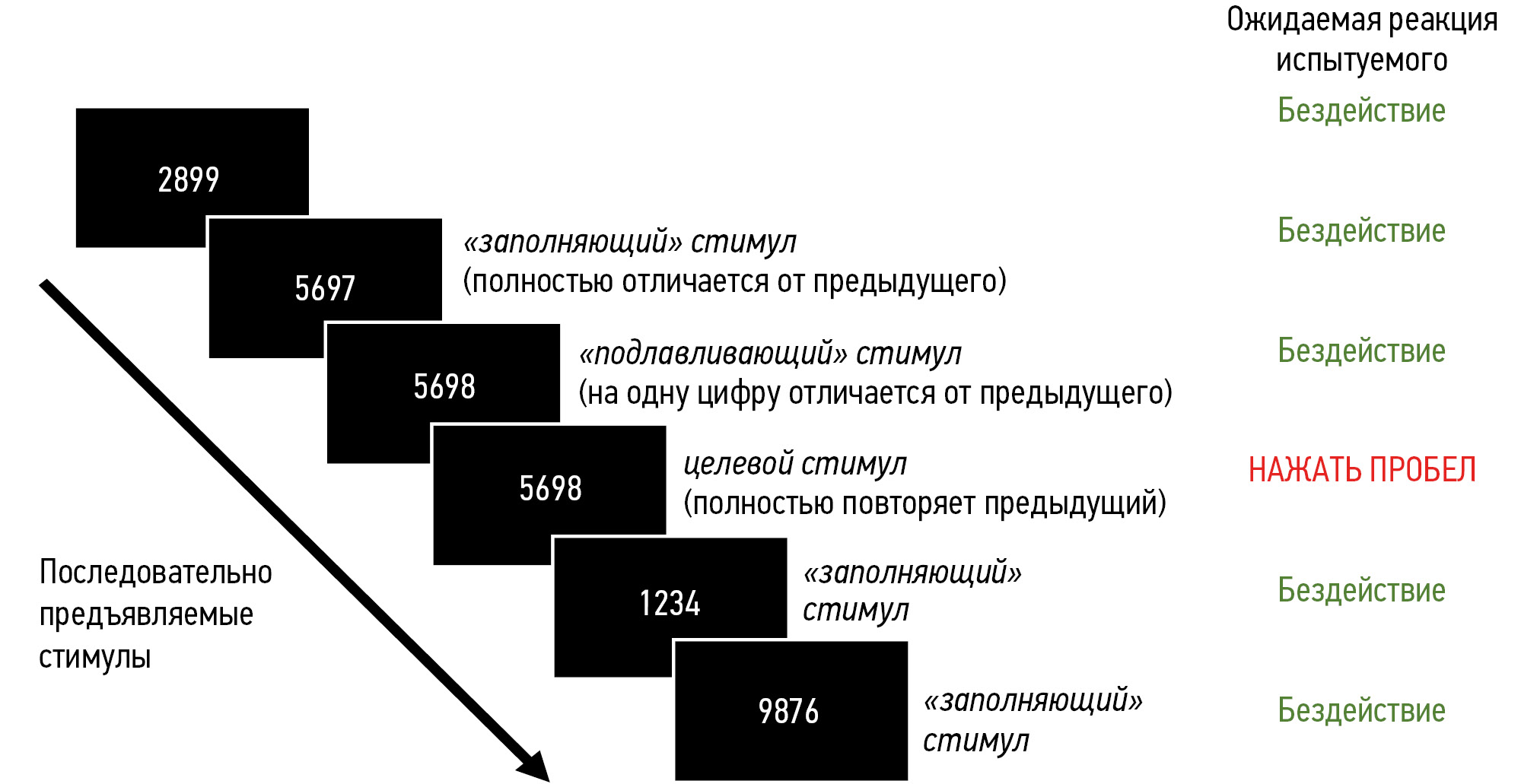 3. «подлавливающие» стимулы — только на одну цифру отличаются от предыдущих и, как и «заполняющие» стимулы, не предполагают никаких действий со стороны испытуемых.