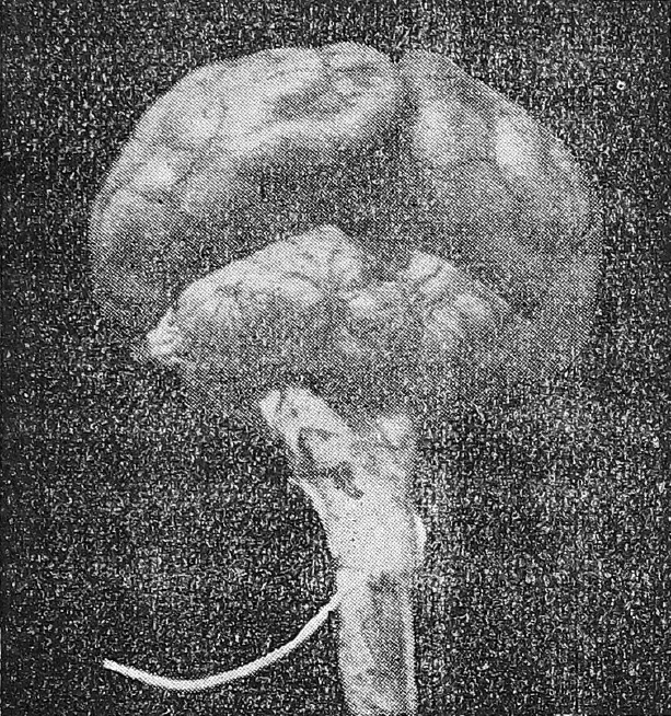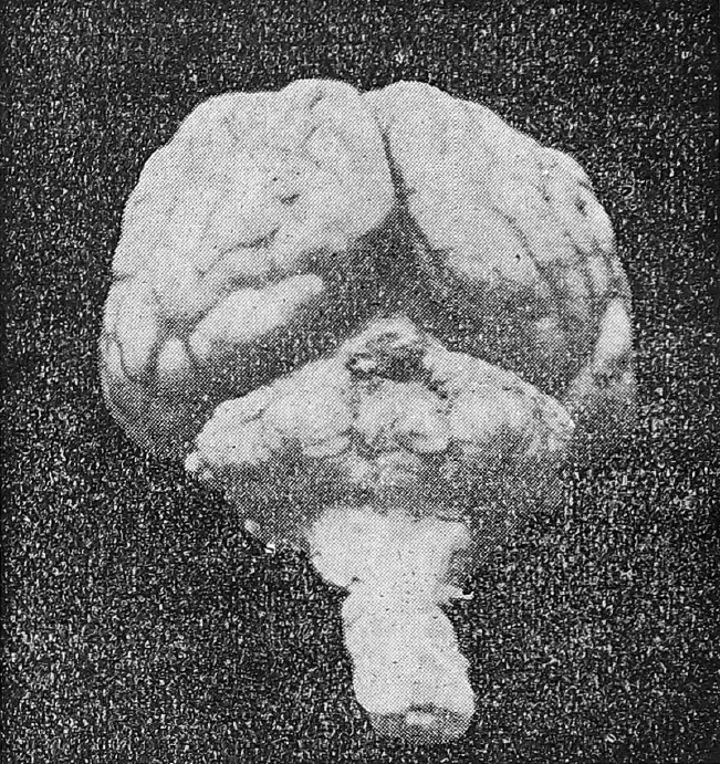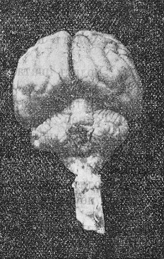 Операція обнаженія твердой мозговой оболочки и мозжечка производилась слѣдующимъ образомъ. Продольный кожный разрѣзъ начинался отъ середины линіи, соединяющей лобныя пазухи и велся по средней линіи до задняго края атланта. Потомъ продольными разрѣзами разсѣкали фасціи и мышцы до надкостницы; послѣ чего, оттягивая разсѣченныя мягкія части въ сторону посредствомъ гирекъ, подвѣшенныхъ пра помощи желѣзныхъ цѣпей къ острымъ желѣзнымъ крючкамъ, распаторомъ отдѣляли надкостницу отъ темянныхъ и височныхъ костей, начиная со средней линіи до мѣста прикрѣпленія ушныхъ раковинъ. Затѣмъ отдѣляли сухожилія мышцъ отъ наружныхъ полукружныхъ линій, начиная съ затылочнаго бугра кнаружи; распаторомъ отдѣляли, начиная со средней линіи, надкостницу съ затылочной кости, и обнажали такимъ образомъ всю затылочную кость и оболочку, покрывающую foramen occipitale magnum. Затѣмъ трепанировали темянныя кости съ обѣихъ сторонъ, соединяли полученныя трепанаціею отверстія, удаляя кость костными щипцами. Кровь, вытекающую изъ костныхъ синусовъ, останавливали выжатою влажною ватою, прокипяченною въ физіологическомъ растворѣ хлористаго натра. Затѣмъ костными щипцами дѣлали въ серединѣ затылочной кости отверстіе, которое расширяли до foramen occipitale magnum, не срѣзывая оболочку, покрывающую foramen occipitale magnum, и не обнажая продолговатаго мозга. Послѣ этого, работая костными щипцами, шли отъ отверстія, образованнаго трепаномъ въ темянныхъ костяхъ, по направленію къ серединѣ затылочной кости до гребня, отдѣляющаго темянныя кости отъ затылочной. На встрѣчу этой, образовавшейся въ темянной кости дорожкѣ, лишенной кости, шли, работая костными щипцами, отъ середины затылочной кости до того же гребня, отдѣляющаго темянную кость отъ затылочной кости. Это дѣлалось симметрично на обѣихъ сторонахъ. Кровь останавливалась, какъ выше упомянуто, выжатою влажною ватою, плотно прижимаемою къ краямъ костей, изъ синусовъ которыхъ, выдѣлялась кровь. Всѣ края кости были такимъ образомъ обложены ватою. Такъ какъ въ гребнѣ заложенъ sinus transversus, то къ разрушенію его костными щипцами приступали лишь подъ самый конецъ, послѣ того какъ все выше изложенное было закончено. Для разрушенія, оставшихся пока цѣлыми, гребней, брались опять-таки костные щипцы. При этомъ, захвативъ гребень щипцами, лишь надламливали его. Быстро продѣлавъ на другой сторонѣ то же самое, захватывали щипцами нижній край темянной кости и, приподнимая его кверху и кзади, вмѣстѣ съ нимъ снимали весь свободный кусокъ кости, образовавшійся всѣдствіе толькочто описаннаго хода операціи. Такъ какъ къ этому кускукости возлѣ средней линіи прикрѣпленъ костный tentorium, то и онъ одновременно вынимался.