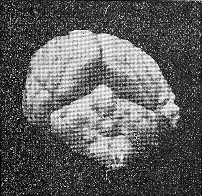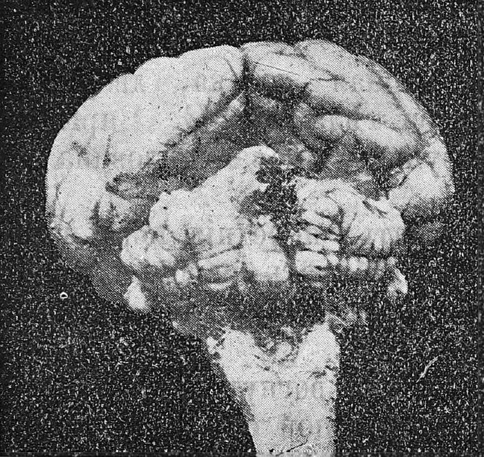Если какое-нибудь полушаріе меньше открылось, то стоитъ только костными щипцами продолжить въ стороны костное отверстіе и срѣзать твердую мозговую оболочку—и все открылось. Кровотеченія при этомъ обыкновенно больше не бываетъ, такъ какъ sinus transversus уничтоженъ.—Дальнѣйшимъ преимуществомъ такой операціи является то состояніе, въ которомъ животное находится послѣ операціи. Уничтоженіе sini transversi приводитъ животное въ своего рода дементное состояніе, находясь въ которомъ животное сохраняетъ то положеніе, которое ему придаютъ механически или въ которое его переводятъ мышцы при электрическомъ раздраженіи червячка мозжечка.