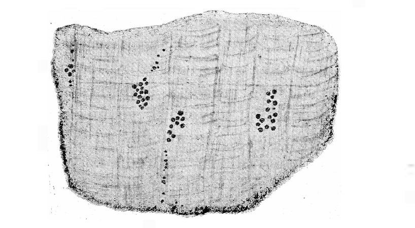 Онѣ располагались у мышечныхъ волоконъ сердца, плотно къ нимъ прилегая, причемъ иногда (см. фиг. 5) такія черныя кучки лежали на мышцахъ совершенно изолированно, иногда же отъ нихъ въ промежутокъ между мышечными волокнами тянулся рядъ черныхъ же, еще болѣе мелкихъ точечекъ, указывавшихъ на нѣкогда бывшее здѣсь, теперь же перерожденное, нервное волокно.