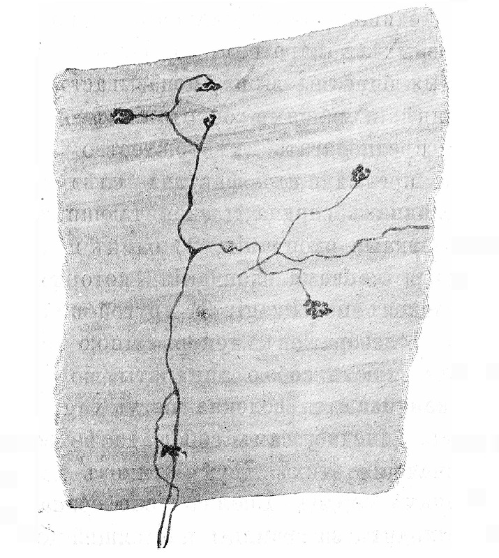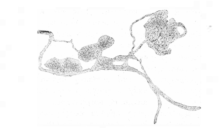 Прежде чѣмъ окончить описаніе инкапсулированныхъ нервныхъ клубочковъ, мнѣ хотѣлось бы сказать нѣсколько словъ объ одномъ изъ моихъ препаратовъ. На этомъ препаратѣ мы видимъ часть кровеноснаго сосуда съ его адвентиціонномъ нервнымъ сплетеніемъ. Мы видимъ также весьма густой инкапсулированный нервный клубочекъ и подходящее къ нему волокно. Если слѣдить за этимъ волокномъ отъ клубка, то можно видѣть, что оно подходитъ къ сосуду, сразу сильно измѣняетъ свое направленіе, согласуй его съ направленіемъ сосуда и смѣшивается съ нервными волокнами, образующими упомянутое адвентиціонное сплетеніе. Получается впечатлѣніе, будто бы оно отходитъ отъ этихъ волоконъ, хотя я на этомъ послѣднемъ пунктѣ и не настаиваю.