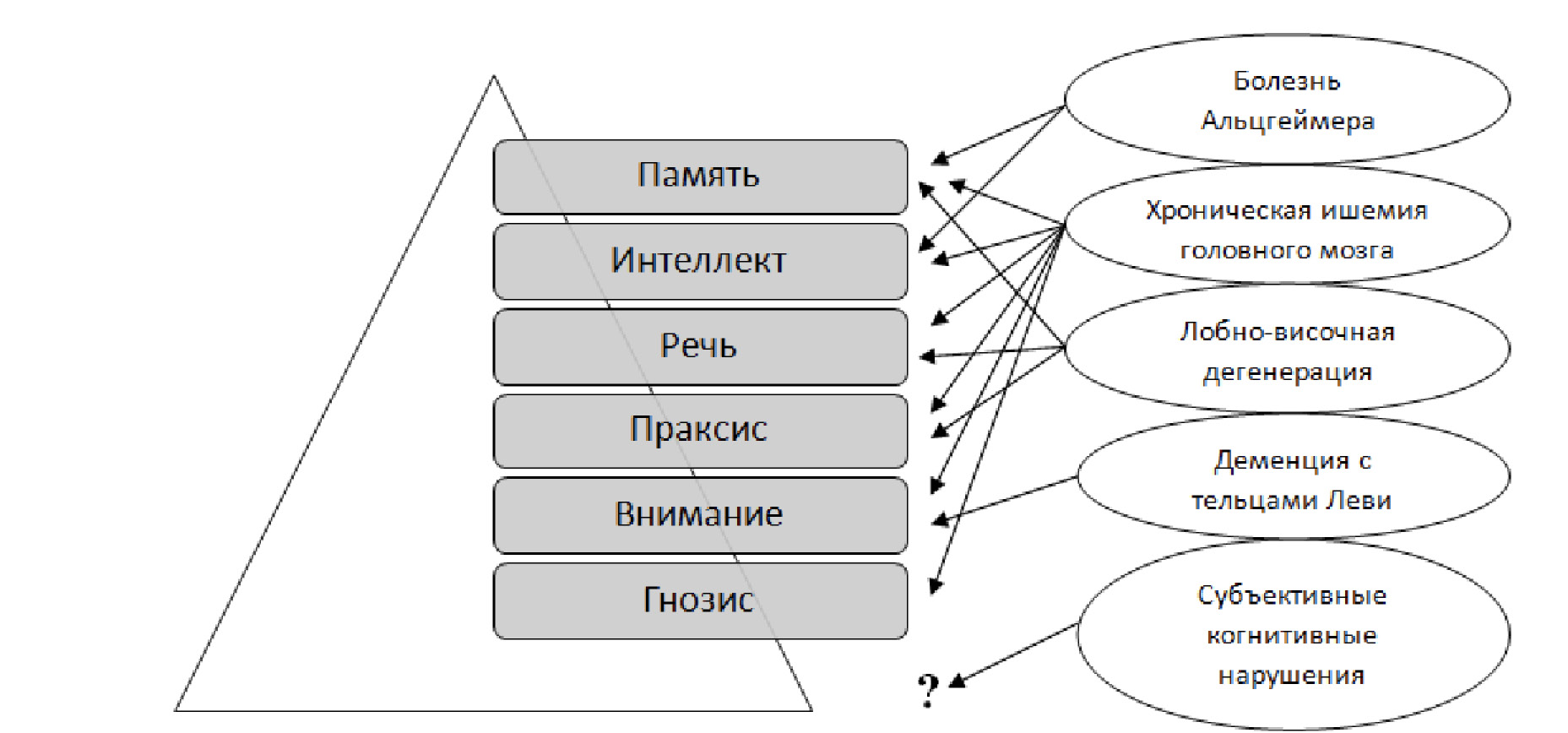 Говоря о заболеваниях, при которых нарушаются когнитивные функции, необходимо упомянуть не только о болезни Альцгеймера, но и о распространённых заболеваниях, которые сопровождаются КН, таких как хроническая ишемия головного мозга, или, как принято называть за рубежом, болезнь малых сосудов, лобно-височная дегенерация, деменция с тельцами Леви.