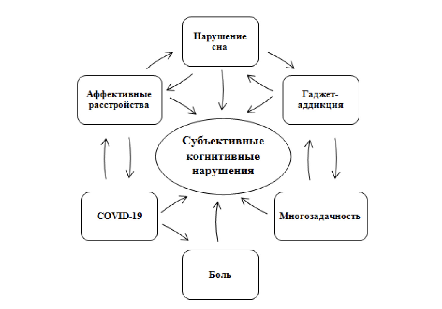 Оценивая все описанные факторы, несложно проследить их влияние друг на друга, приводящее к когнитивной дисфункции, например «гаджет-аддикция — многозадачность», или «аффективные расстройства — инсомния», «боль — тревога — инсомния».