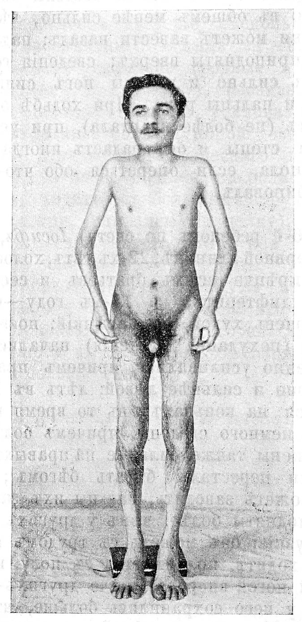 Къ 16 г. руки и ноги еще болѣе ослабѣли и въ нихъ стали замѣтно выражены сведенія; при ходьбѣ пятки не касались уже пола; затѣмъ измѣнилась и конфигурація спины; на 17-мъ году ходилъ съ посторонней поддержкой, но съ 18 лѣтъ сталъ пополнѣе и покрѣпче, могъ лучше ходить; черезъ 1—2 года состояніе ухудшилось, руки и ноги еще больше ослабѣли и похудѣли. На 19-мъ году втеченіе нѣсколькихъ недѣль ощущалъ боли при ходьбѣ въ щиколкахъ; ни раньше, ни послѣ того никакихъ болей не испытывалъ нигдѣ. Лѣтъ съ 20 при ходьбѣ ноги иногда подкашивались и падалъ,— вставалъ съ полу съ большимъ затрудненіемъ; ходилъ съ палкой. На 23-мъ году пополнѣлъ, а потомъ опять началъ худѣть; ходилъ съ трудомъ и быстро утомлялся, послѣ чего ноги тряслись и подкашивались.