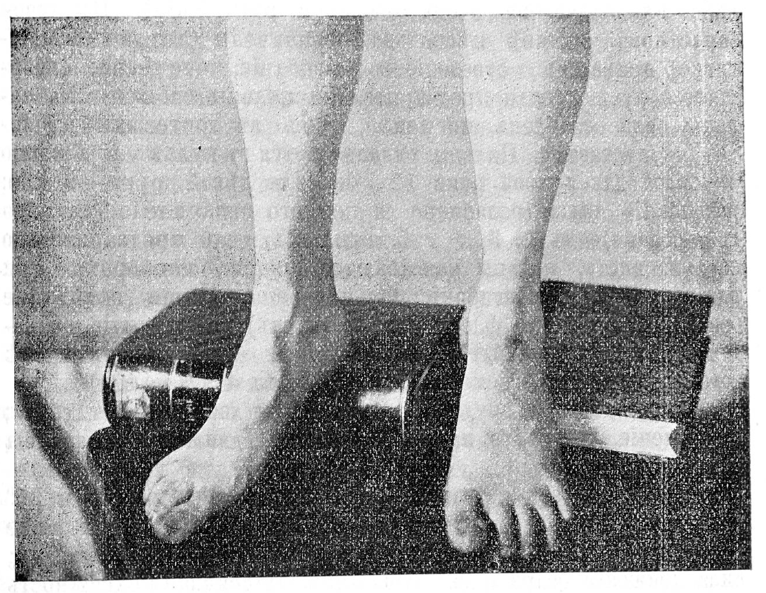 При стояніи пятки приподняты отъ полу—правая на 3 cnt., лѣвая на 1 cnt. и больной опирается исключительно на переднія части стопъ и пальцы; послѣдніе при этомъ расходятся еще болѣе (веерообразно), а самое стояніе оказывается неустойчивымъ (замѣтны сокращенія отдѣльныхъ мышцъ и мышечныхъ группъ при стремленіи сохранить равновѣсіе). При ходьбѣ рѣзко выступаетъ тыльное разгибаніе большихъ пальцевъ ногъ, лѣвая пятка касается пола лишь въ моментъ наступанія, правая же совсѣмъ не касается пола; походка утиная—туловище отклоняется то вправо, то влѣво, медленная, шагъ коротокъ. Со сдвинутыми ногами стоитъ свободно, на одной ногѣ устоять трудно (въ обуви лучше, чѣмъ босому). Бѣгъ невозможенъ (вмѣсто него—неправильная, ускоренная ходьба). Подъемъ по крутой лѣстницѣ возможенъ лишь при помощи рукъ (идетъ впередъ лѣвой ногой); тоже и при вставаніи съ колѣнъ; при вставаніи съ колѣнъ своеобразный пріемъ: поставивъ правую голень вертикально, больной опирается руками на самый нижній отдѣлъ бедра, съ большимъ усиліемъ разгибаетъ (выпрямляетъ) бедро, поднимая туловище, и такимъ образомъ, постепенно выпрямляясь, встаетъ. Ходить больному легче, чѣмъ стоять; можетъ пройти верстъ десять заразъ, при чемъ сначала ходьба затруднительна, а потомъ больной „разойдется“ и идетъ легче; при неровности пола, дороги спотыкается и даже падаетъ. Временами, по его словамъ, появляется внезапная слабость, подкашиваются ноги и онъ падаетъ. Поворачиваніе на постели затруднительно и происходитъ съ помощью рукъ, также какъ и переходъ изъ лежачаго положенія въ сидячее. Сидѣть на постели съ вытянутыми ногами не можетъ, а долженъ ихъ опустить на полъ. На колѣни опускается съ трудомъ, едва не падая.