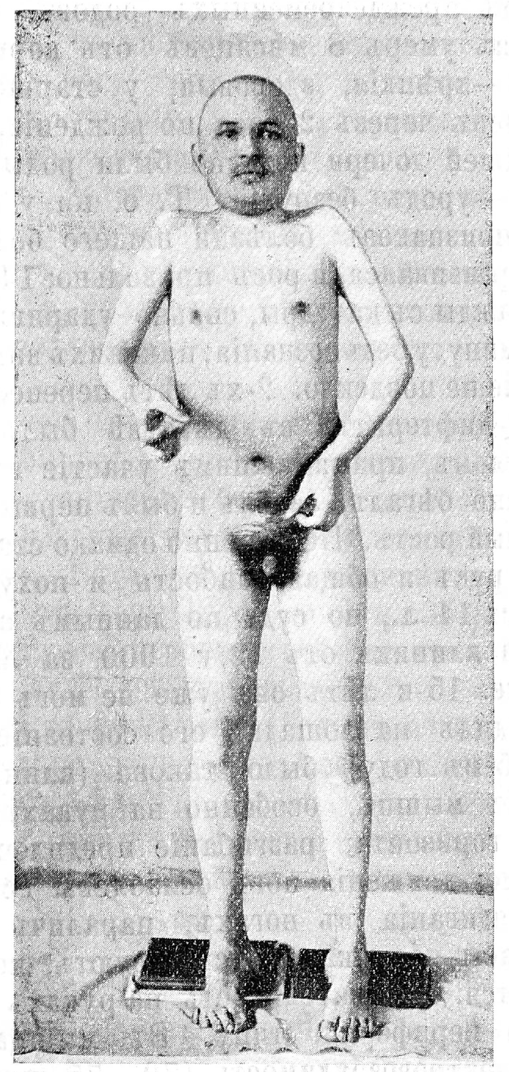 Рис. 3. Мих. С. Ал—въ (бросается въ глаза приподнятое состояніе надплечій, сведеніе рукъ, стопъ, похуданіе мускулатуры).