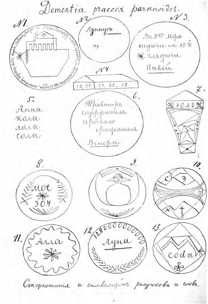 Изъ исторіи болѣзни видно, что поведеніе больной стереотипно. Ежедневно больная повязываетъ на головѣ платокъ особеннымъ образомъ—такая повязка „облегчаетъ ея сознаніе“. Ежедневно рисуетъ почти одни и тѣ же рисунки на стѣнѣ и придаетъ имъ одно и тоже символическое значеніе охраняющее ея здоровье, совѣсть и сознаніе. Въ поведеніи и отвѣтахъ ясно выраженъ негативизмъ. Охотно идетъ гулять, пока ей этого не предлагаютъ, но стоитъ предложить и больная отказывается. Изъ разговора съ больной можно косьвенпымъ путемъ узнать, гдѣ она жила и училась, когда оставила учебное заведеніе, но отъ прямыхъ отвѣтовъ она уклоняется. Такъ на вопросъ въ какомъ городѣ она училась, отвѣчаетъ: „въ опальномъ на военномъ положеніи“. Въ какой гимназіи учились? „Учиться то училась, да ничему не выучилась“ Гдѣ вы раньше жили? „Гдѣ и теперь живу“. А сейчасъ въ какомъ городѣ? „Въ огородѣ, а не въ городѣ“. Гдѣ вы находитесь? „И этого не знаю“. И не интересуетесь? „По землѣ я знаю, по старому времени я знаю. Я сознаніемъ нахожусь въ прошедшемъ, когда наше государство еще не раздѣлялось“. Сколько вамъ лѣтъ? „Не знаю когда въ послѣдній разъродилась“. Память пострадала значительно. Сама больная говоритъ: „память была когда то хорошая, а теперь никуда не годится“ Больная растеряла почти всѣ свои знанія. На вопросъ, какіе города знаете? Отвѣтила: „Питеръ, Бобруйскъ —больше нe знаю“.