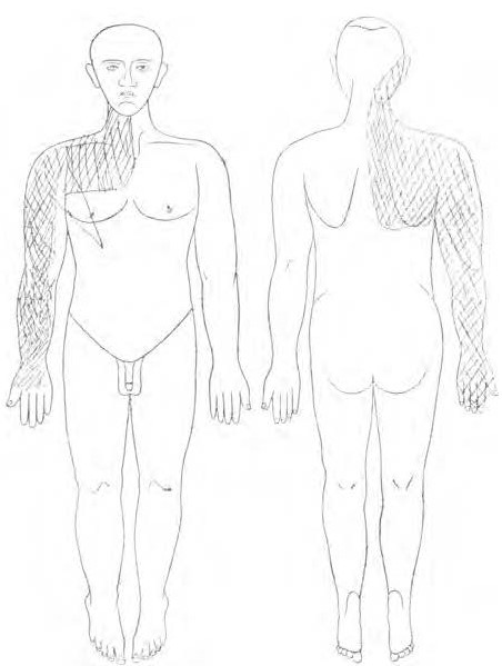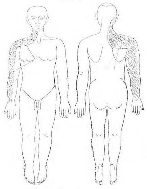 Чувствительность: на правой рукѣ на плечѣ въ отдѣльныхъ участкахъ укола отъ прикосновенія не отличаетъ; на задней (разгибательной) поверхности руки, какъ на плечѣ, такъ и на предплечьи, чувствуетъ хуже, чѣмъ на передней. На ладони чувствуетъ лучше, чѣмъ на плечѣ; на ладони же лучше, чѣмъ на тыльной поверхности кисти. Ясная граница пониженія болевой чувствительности приблизительно въ средней трети предплечья (на сгибательной сторонѣ); на плечѣ на сгибательной же поверхности снутри больная чувствуетъ лучше, чѣмъ снаружи. На задней (разгибательной) поверхности пониженіе болевой чувствительности одинаково по всему длиннику руки. На спинѣ граница на уровнѣ нижняго угла лопатки, вверху таже, что и раньше. Тактильное и температурное безъ измѣненій сравнительно съ прежнимъ изслѣдованіемъ (см. схему № 2).