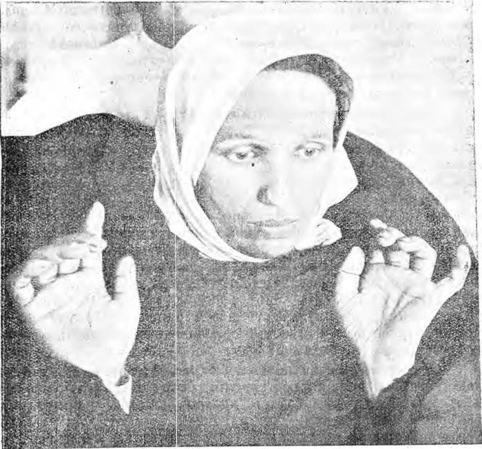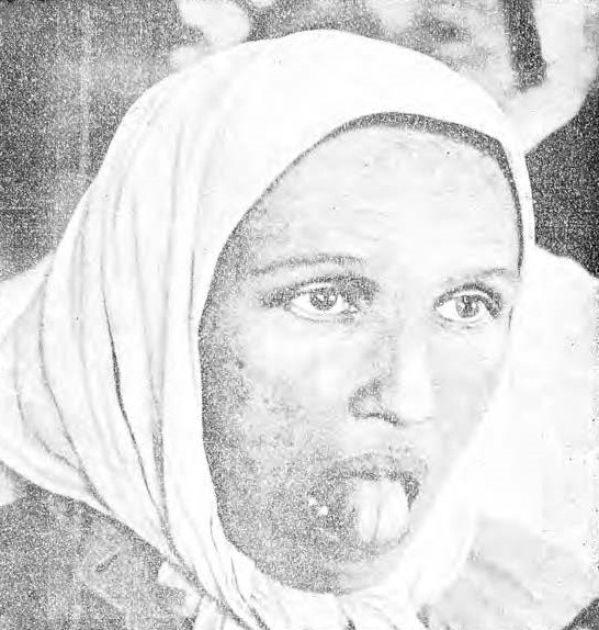 При показываніи зубовъ уголъ рта отклоняется влѣво, причемъ носогубная складка справа почти не замѣтна. Верхнее вѣко отстаетъ въ движеніи за глазными яблоками—двухсторонній симптомъ Graefé. Движеніе губъ недостаточно, свистѣть больная не можетъ, щеки надуваетъ очень слабо. Masseteri выражены достаточно; движенія мягкаго нёба вялы, правая половина нёбной занавѣски поднимается лучше. Языкъ рѣзко отклоненъ вправо, движенія языка ограничены; поверхность его волнообразная вслѣдствіе атрофіи, главнымъ образомъ, правой половины; въ языкѣ фибриллярныя подергиванья. Глотаніе затруднено, причемъ пища, т. е. родъ ея, не играетъ роли; больная поперхается. Движенія головы и шеи достаточны.