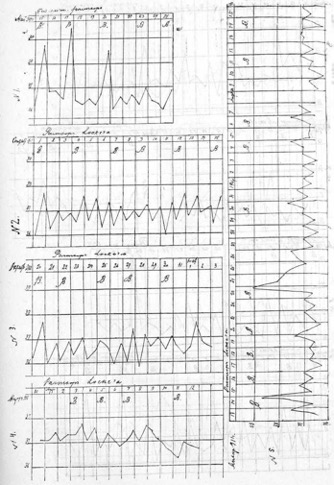 Съ 11 февр. по 12 марта 1911 г. ему было сдѣлано еще 10 вливаній по 60,0 раствора Locke’a, также не давшихъ замѣтнаго терапевтическаго эффекта, и только доставившихъ незначительное облегченіе (см. кр. № 9). Во время впрыскиваній здѣсь только получались незначительныя повышенія t-ры, maximum 370, несопровождавшіяся болѣзненными явленіями, тогда какъ при вливаніяхъ физіологическаго раствора соли и того же раствора соли съ примисью Со1 С12 при первомъ леченіи т-ра повышалась до 40° 11).