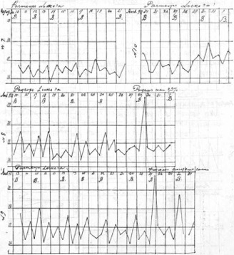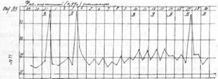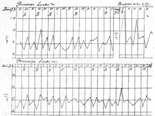 34) Ч—въ В. М., крестьянинъ Чебокс. у., занятіе-—хлѣбопашество, алкоголемъ не злоупотреблялъ. Боленъ съ 1-го сент. 1913 г., причина болѣзни—простуда. Хорошо развитъ и упитанъ. Болитъ поясница и дѣвая нога сзади, по ходу n. ischiad. настолько сильно, что больной не можетъ ходить безъ помощи палки. Искривленіе позвоночника вправо (викарный сколіозъ); симптомъ Lasegue’a, нѣсколько повышена к. б. чувствительность сзади и снаружи бедра, колѣнной рефлексъ оживленъ. Бъ б-цу помѣщенъ 29 октября 1913 г. Дiagnosis: ischias sin. Было сдѣлано семь инъекцій солевого раствора (физ. раст. 0,9%) въ лѣвую ягодицу и бедро по ходу нерва, давшія блестящій результатъ въ смыслѣ излеченія. Больной ходитъ свободно, осталась едва замѣтная болѣзненность при давленіи и легкій симптомъ Lasegue’a. Т-ра во время инъекцій повыша лась и оч. сильно послѣ первой и шестой инъекцій, не давая значительныхъ повышеній послѣ остальныхъ инъекцій (см. кр. № 14).
