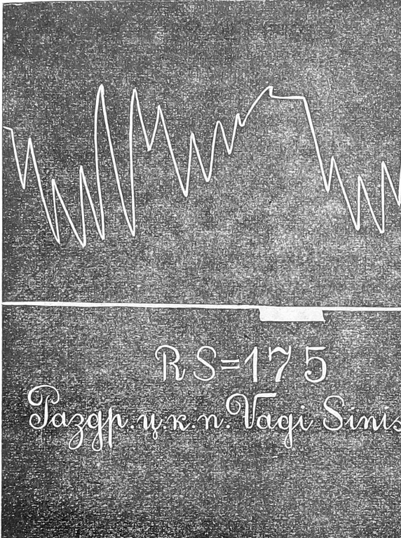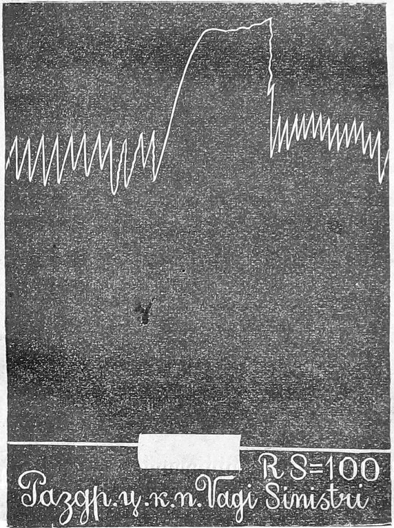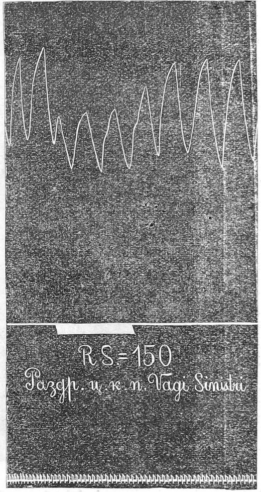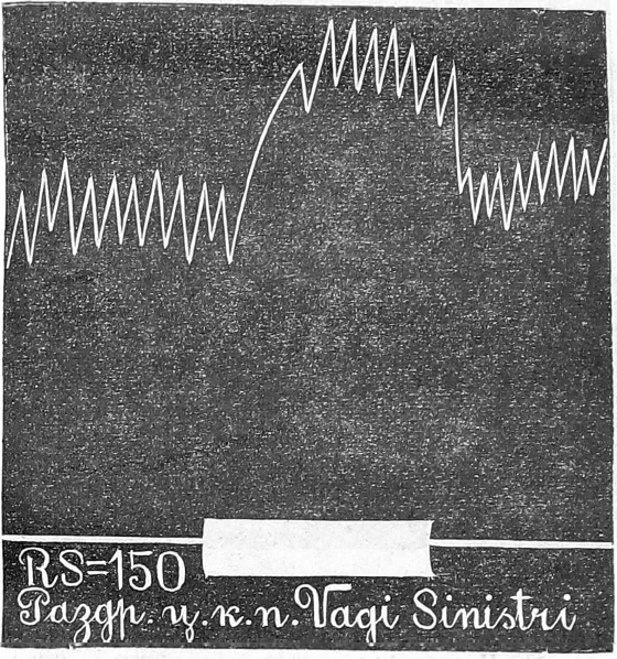 11 ч. 18'. Соединен. съ ниш. приб., бараб. пущ. въ ходъ. Раздраж. ц. к n. vagi sinis. при RS=180—непродолжительная экспираторная остановка дыханія, уменьшеніе высоты кривой дыханія (приблиз. до ⅓ ея первоначал. высоты), сдвигъ въ сторону экспираціи, глубокая инспирація. Бараб. останов., трахеал. канюл. разъединена.